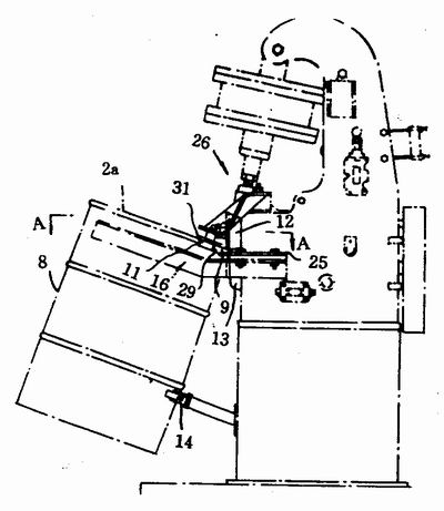 圖2是本發明的鋼桶桶口卷邊開卷裝置。圖中正(zhèng)在對一開口桶8的(de)桶口卷(juàn)邊進行開卷。此時,蓋3和(hé)填充劑4是沒有(yǒu)的。鋼桶桶口卷邊2a朝上。圖2中所(suǒ)示的犁形開卷器9有一個(gè)鼻狀體10(見圖3)。它的伸出高度(dù)不超過(guò)鋼桶桶口卷邊2a。導向輥輪(lún)11與犁形開卷器9相對府-對(duì)鋼桶桶口內壁進行擠壓。導向輥輪的外(wài)圍法蘭(lán)31超過鋼桶桶口卷邊2a的上表(biǎo)麵。