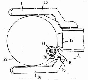 然後,輥輪12和13被同時驅動,拖動鋼桶桶口卷邊2a倚於犁形開卷器的鼻狀物10上來展開它。導向(xiàng)輥輪1也與輥輪12配合(hé)動作。輥輪12可采用氣(qì)動或液(yè)壓來推動。