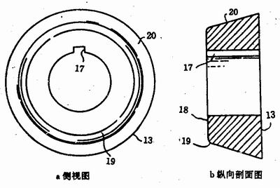 圖4說明下輥輪13通過鍵槽被固定在(zài)驅動軸上。輥(gǔn)輪的外表麵20與它的前(qián)端麵18的垂線具有(yǒu)15°的(de)夾角。輥輪的前端麵18與(yǔ)外緣轉角(jiǎo)處倒成圓角。