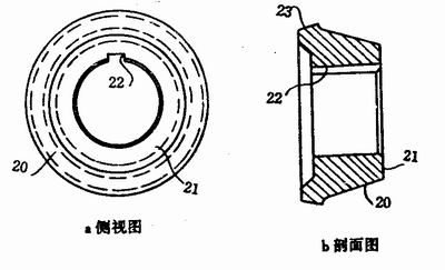 圖5所展示的是上輥輪12的視圖。它具有一個向(xiàng)後端麵(miàn)21斜削的外表(biǎo)麵20°它也通過鍵槽22被固定在驅動軸(zhóu)上。輥輪12和13的驅動軸是平行的(de)。由(yóu)於(yú)兩輪外緣斜度一致,所以它們的外表麵是互相齧合的。上輥輪12的前端外緣有一個凸(tū)緣23,凸緣(yuán)和後表麵20的接合(hé)部呈(chéng)圓弧狀。此圓弧(hú)和下輥輪13的圓角19(見圖4)表麵互補(bǔ)。這樣,圖1中的桶口卷邊展開後的翻邊24處就不會形成一個折角。它的曲率半徑最好為8.75mm。
