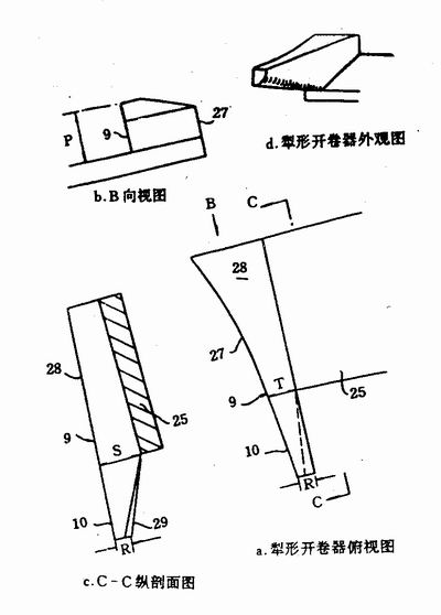 如圖6所示,犁形開(kāi)卷器9固定在平板25上(見圖1)。而此平板則通過(guò)螺栓固定在圖2所示的設備的機架上。犁形開卷器9的大致,外形受囤2和6d。它具有一個與鋼桶桶身外表曲麵相匹配的弧形內表麵(miàn),其曲率半徑為28.6cm。從圖6a中也可(kě)看到它的機體是斜削的,鼻狀(zhuàng)物10的(de)斜削始於平板25。實際上(shàng),在具體(tǐ)設備中,它的上表麵28與平板25呈4°夾(jiá)角(jiǎo)。鼻狀物10的下部外表麵29倒成圓角,當它對鋼桶桶口卷邊(biān)進行(háng)開卷動作(zuò)時,與(yǔ)卷邊2a的端部30接觸。